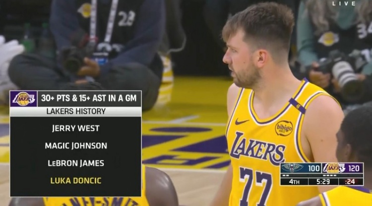 3月5日讯 NBA常规赛,湖人和鹈鹕的比赛正在进行。截至发稿前,湖人球星东契奇已砍下30分15助攻,成为湖人队史单场同时拿到30+得分和15助攻的第4人。前三位分别是杰里-韦斯特、魔术师约翰逊和勒布朗