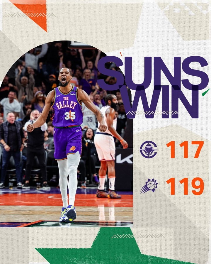 3月5日讯 NBA常规赛,太阳119-117险胜快船。赛后,太阳官方晒出赢球海报,为球队获胜立下大功的杜兰特登上封面,哈登成为背景。杜兰特全场出战41分8秒,22投10中(三分11中4)、罚球10中1