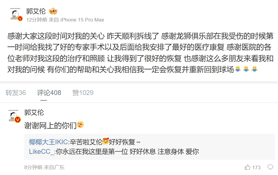 03月05日讯 刚刚,郭艾伦更新微博,透露自己受伤的眼睛已经拆线,并表示会重返球场。