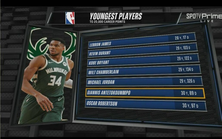 字母哥30岁89天解锁2万分历史第6年轻 仅次于詹杜科&大帅&乔丹?