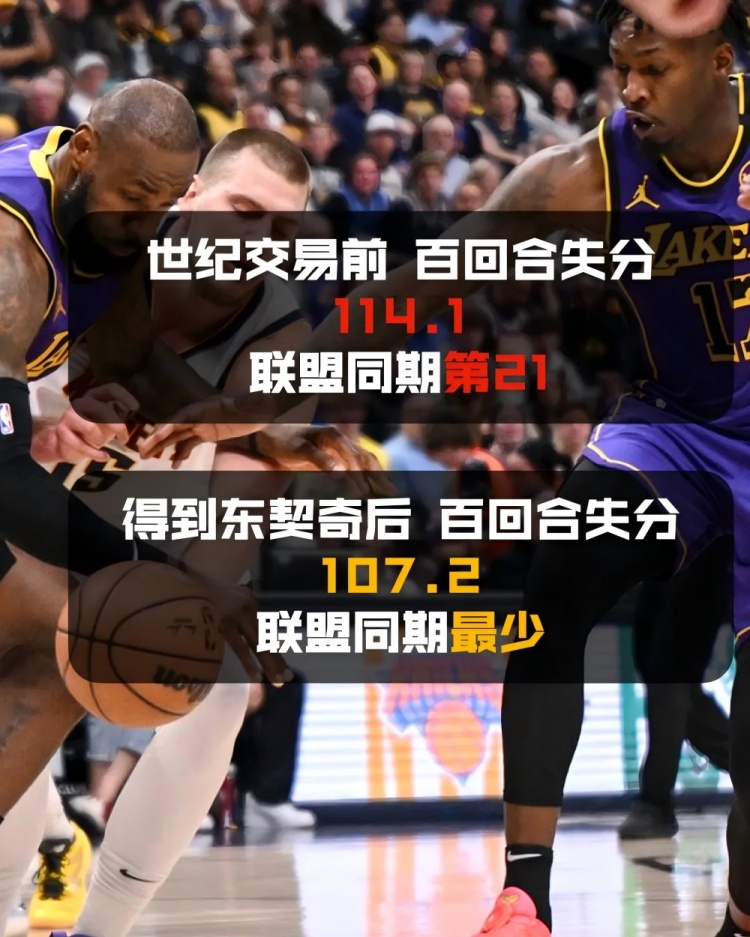 而比起进攻端如虎添翼,令人惊讶的是,他们在防守端更是打出了前所未有的质量。在一个被质疑“防守有巨大问题”的东契奇加入之后,湖人队反而成为百回合失分同期最少的球队。他们每百回合足足少丢了6.9分,成为交易日后联盟独一档的防守铁军。