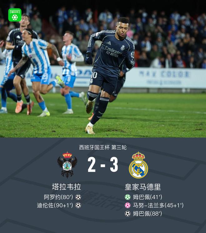 北京时间12月18日西班牙国王杯 第三轮,塔拉韦拉对阵皇家马德里。塔拉韦拉阿罗约破门,迪伦佐破门,马努-法兰多自摆乌龙。皇家马德里姆巴佩梅开二度。最终比分塔拉韦拉 2-3 皇马。